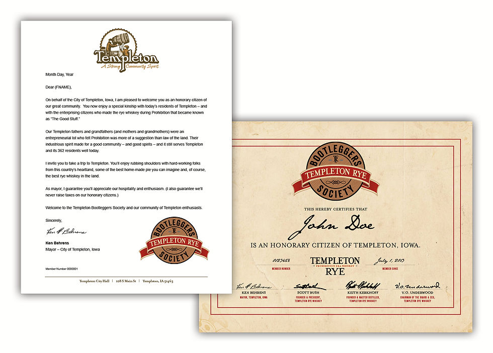 A loyalty program developed for Templeton Rye fanatics. The program was rolled out with a welcome packet containing a letter from the mayor of Templeton, Iowa, an honorary citizen certificate, coasters, postcards and a frame.